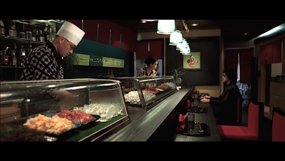 | Oh Dae-su (right, Choi Min-sik) goes to a sushi restaurant after he escapes from imprisonment. |