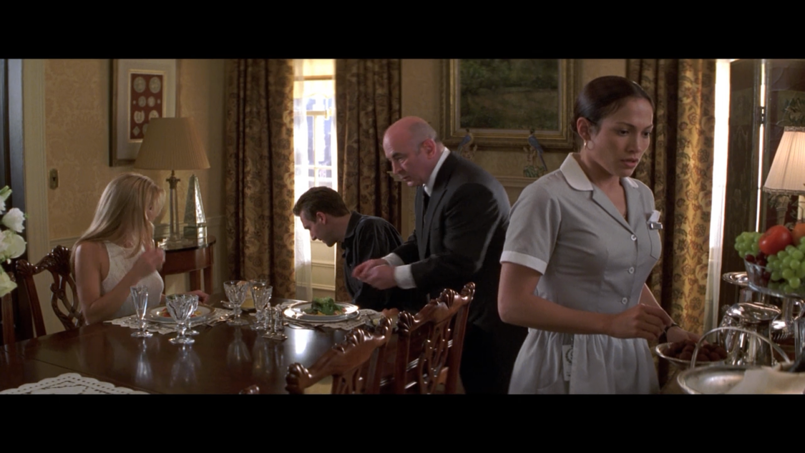 A hotel maid named Marisa Ventura (Jennifer Lopez) tries on a dress and is mistaken by a politician (Ralph Fiennes) as a socialite.